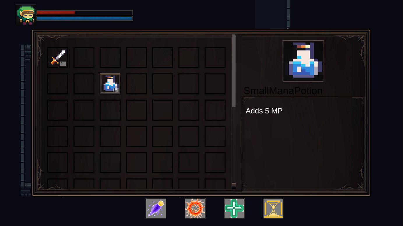 An inventory UI with scrolling, pickup/swapping, and data serialization for saving. Each item is a scriptable object that holds stat effects, player stat modifications, and more.