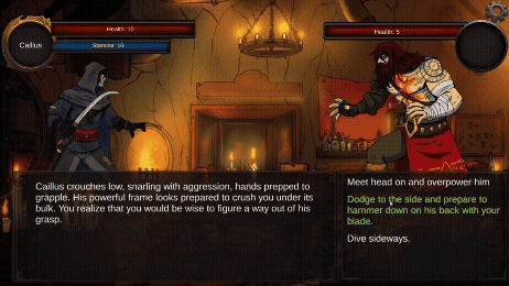 I designed a text-based combat system where the player selects options based on the information available to them. Each round, the enemy randomly selects an action based on their internal stamina tracker. The description of their action is listed, which hints to their intent and intensity of their attack. The main character is a smaller, rouge-type character, so often the correct action involves indirect responses.