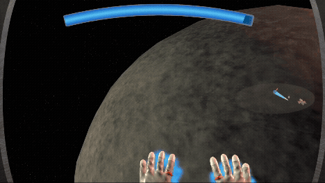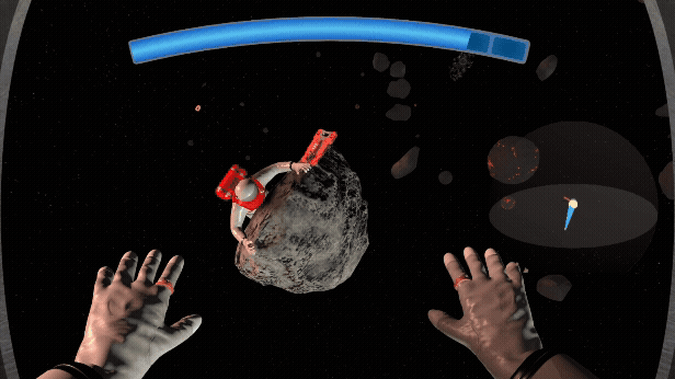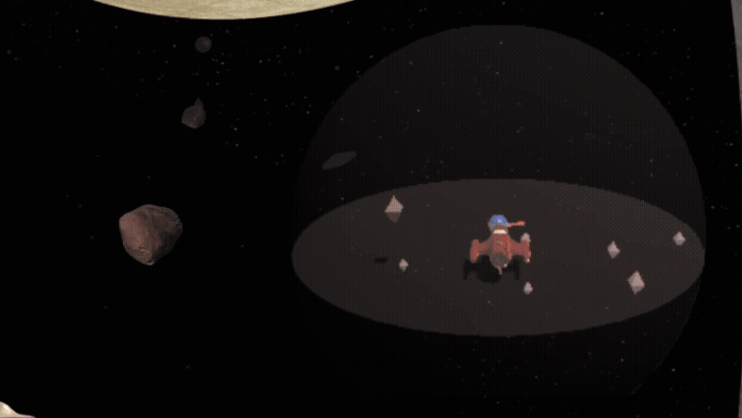 I designed and implemented a mini map that follows the player and gave 1-1 locations of all asteroids and hazards in the 3D space around the player. In the center is a pointer that tracks and represents orientation and directional aiming respective to the “forward” direction of the map.